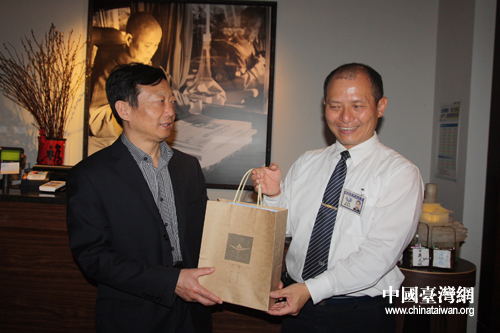 中國宋慶齡基金會副秘書長喬健與慈濟基金會秘書處專員劉鈞安交換禮物(中國臺灣網 徐維彬 攝)