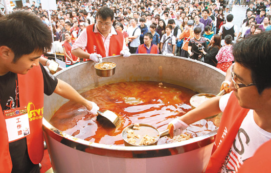臺灣“史上最大臭豆腐罐頭”及最多人同時分食臭豆腐挑戰(zhàn)吉尼斯世界紀錄活動。(圖片來源:臺灣《聯(lián)合報》報道)