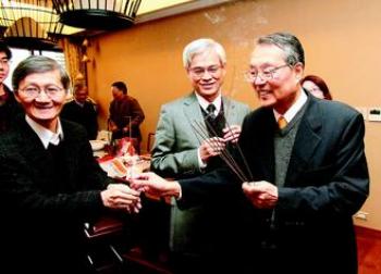 臺灣宏碁集團高層主管昨天到創辦人施振榮(右)家中拜年,并祭拜施振榮供奉的地母,祈求來年平安順利。(圖片來源于:臺灣《聯合報》)