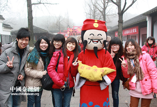 臺灣學(xué)生和大陸高校志愿者在虎丘門前合影。(中國臺灣網(wǎng) 栗琰 攝)