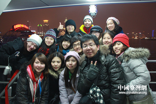 臺灣學(xué)生和大陸高校志愿者在黃浦江游輪上合影。(中國臺灣網(wǎng) 栗琰 攝)