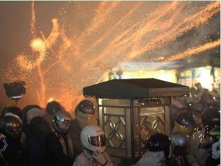 臺(tái)南鹽水蜂炮活動(dòng)6日晚間進(jìn)入施放最高峰,神轎隊(duì)伍分4條路線在主要市區(qū)道路繞行,蜂炮城密集施放,大批游客跟在后方,體驗(yàn)蜂炮炸射快感。(圖片來自臺(tái)灣媒體)