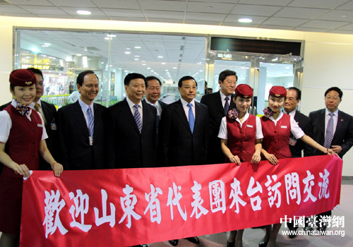 2011年7月11日,山東省省長姜大明、副省長才利民等在臺灣桃園機場受到歡迎。(圖片來源:山東省臺辦)