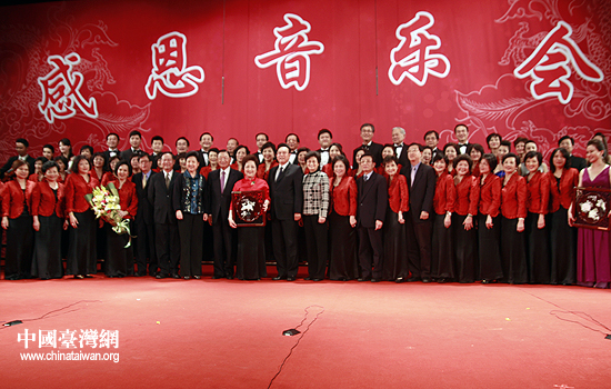 中國臺灣網4月26日北京消息 成立二十二年的北京臺資企業協會25日舉辦感恩音樂會,海協會會長陳云林、;鶗麻L江丙坤應邀到場與在京臺商同慶。音樂會由臺灣雅樂合唱團和臺中圓滿室內樂團聯手奉獻,藝人柯以敏主持并獻唱。(記者 張瑞宸)
