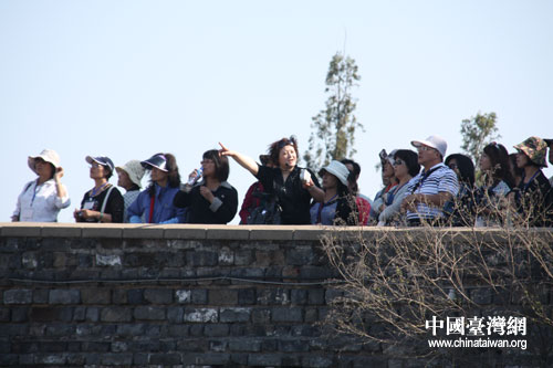 在山海關(guān),臺(tái)灣民眾踏尋臺(tái)階,攀登而上,遙望遠(yuǎn)處山脈上盤旋的長(zhǎng)城。(中國臺(tái)灣網(wǎng) 郜利敏 攝)