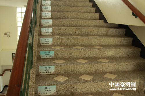 每個樓梯臺階都有關(guān)于服裝類的中文、英文、閩南語貼畫。(中國臺灣網(wǎng) 李丹 攝)