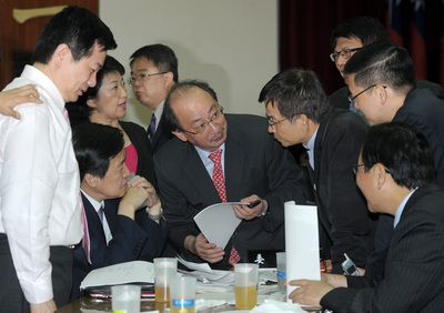 民進黨“立院”黨團總召柯建銘(中)在晚間與“立委”交換意見。圖片來源:臺灣“中央社”