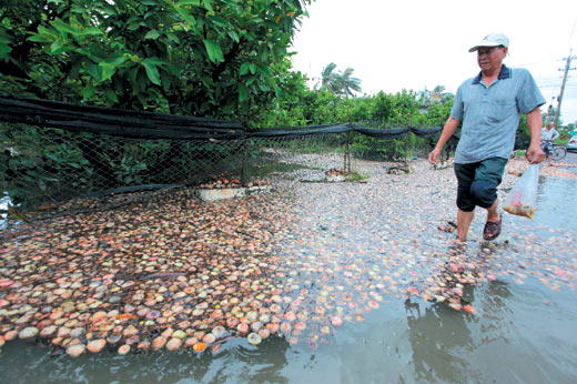 豪大雨造成屏東林邊淹水不退,當(dāng)?shù)厣忟F落果嚴(yán)重,農(nóng)民欲哭無(wú)淚,擔(dān)心連蓮霧樹(shù)株也將不保。圖片來(lái)源:臺(tái)灣《聯(lián)合報(bào)》