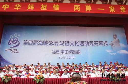 中國臺灣網6月15日莆田消息 以“中華馬祖情、兩岸一家親”為主題的第四屆海峽論壇·媽祖文化活動周于今日上午在湄洲島天后廣場舉行開幕式。本屆媽祖文化活動周以全國臺聯為指導單位,由莆田市人民政府、福建省臺辦、福建省臺聯共同主辦。莆田市政協主席林慶生主持了開幕式,莆田市長梁建勇致歡迎詞,中華媽祖文化交流協會副會長兼秘書長、湄洲媽祖祖廟董事長林金榜及臺灣媽祖宮廟代表蔡詠锝致辭。在開幕式上,全國臺聯主席梁國揚等四位嘉賓共同啟動“第四屆海峽論壇·媽祖文化活動周”開幕按鈕。