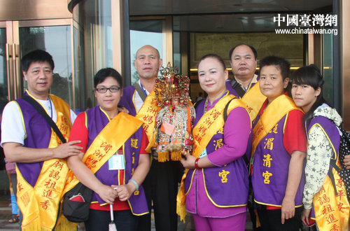來自花蓮湄清宮的媽祖信眾代表懷抱湄清宮的媽祖像來到湄洲島。(中國臺灣網 郭瑩瑩 攝)