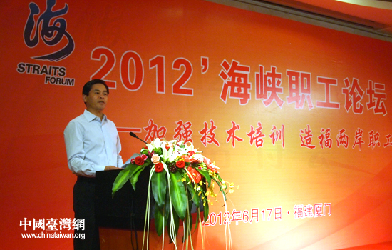 17日,第四屆海峽論壇·海峽職工論壇在廈門舉行。圖為中華全國總工會副主席、中國職工交流中心會長陳豪致辭。(中國臺灣網 張瑞宸 攝)