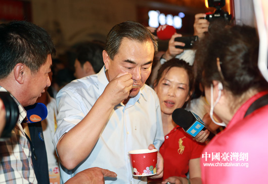 中國臺灣網6月18日廈門消息 中共中央臺辦、國務院臺辦主任王毅17日晚走進廈門市中山路,逛臺灣特色廟會,品原味道地小吃,看文化創意產品,與攤主拉家常話發展。