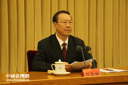 全國政協副主席、中共中央統戰部部長、中國和平統一促進會執行副會長杜青林在會議上做了題為《深化和平發展 著力爭取民心 促進祖國統一》的工作報告。(中國臺灣網 王君飛 攝)