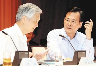 臺灣電力公司昨日舉行股東會,董事長黃重球(右)擔任主席,主持任內首次的股東會,并在會前與總經理李漢申(左)交換意見。