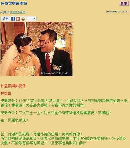 昵稱悲憨居士的網(wǎng)友在部落格中分析姓名,網(wǎng)頁出版時間為2006年6月12日,他以林益世和彭愛佳的名字進行分析,寫到林益世屬“山天大畜”卦,此卦大好大壞,一生起伏很大。有突發(fā)性災(zāi)難的磁場,有貪不義之財?shù)膬A向。