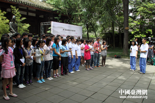 7月4日下午,參加第三屆“臺(tái)灣學(xué)生天府夏令營(yíng)”活動(dòng)的105名師生與成都七中的學(xué)生們一道漫步杜甫草堂,聽取巴蜀文化講座,共同吟誦“詩(shī)圣”杜甫的名篇佳作,感受中華文化源遠(yuǎn)流長(zhǎng)。(中國(guó)臺(tái)灣網(wǎng) 王偉 攝)