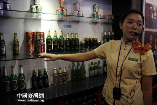 “情系齊魯——兩岸文化聯誼行”參訪嘉賓參觀青島啤酒博物館,講解員介紹青啤種類。(中國臺灣網 芮益芳 攝)