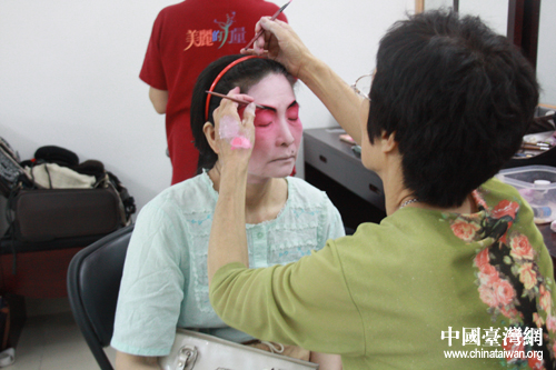 臺(tái)灣師范大學(xué)昆曲研究社、中華昆曲藝術(shù)協(xié)進(jìn)會(huì)常務(wù)理事蔡孟珍女士在后臺(tái)上妝。(中國臺(tái)灣網(wǎng) 孟雅詩 攝)