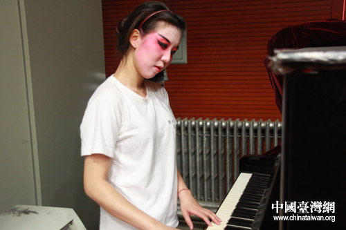 在后臺(tái)彈鋼琴的昆曲演員。(中國臺(tái)灣網(wǎng) 孟雅詩 攝)