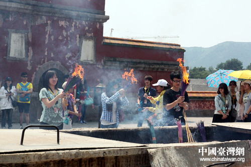 臺灣學生向觀世音菩薩上香許愿。(中國臺灣網 劉承思 攝)