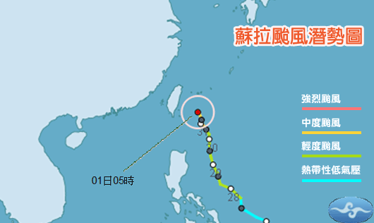 昨晚11時(shí),蘇拉的中心位置在鵝鑾鼻東方約320公里的海面上,以每小時(shí)9公里的速度向北北西行進(jìn)。氣象局第一組防災(zāi)科科長(zhǎng)謝明昌指出,今天白天宜蘭、花蓮、新北首當(dāng)其沖,整天會(huì)下400至700毫米;下午開始轉(zhuǎn)吹西北風(fēng),桃竹苗和南投山區(qū)也將降下超大豪雨。