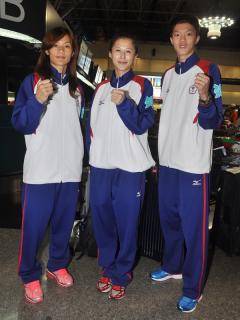 今日,肩負倫敦奧運奪金希望的中華臺北跆拳道代表隊啟程前往倫敦,選手魏辰洋(右起)、楊淑君及曾櫟騁,都信心滿滿。 圖片來源:臺灣媒體