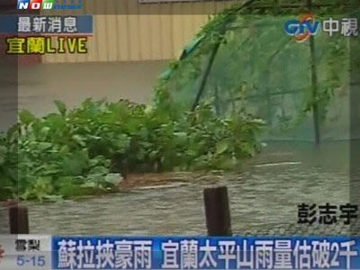 氣象局估計宜蘭太平山累積雨量恐破千,海水倒灌導(dǎo)致宜蘭路面農(nóng)田和道路分不清。圖片來源:臺灣“今日新聞”