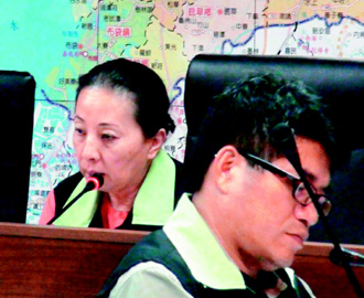 嘉義縣長張花冠(后排左)昨晚現身主持蘇拉緊急應變中心會議。來源:臺灣《聯合報》