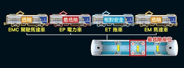 區間車以外觀標有ET(箭頭)字樣的無動力車廂相對較安全。來源:臺灣媒體