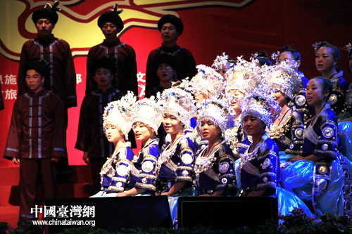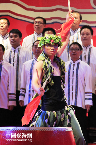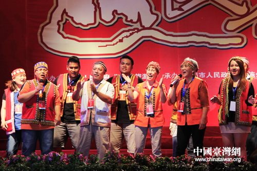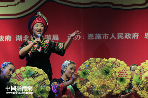 恩施市山民歌匯25日晚間上演,圖為臺(tái)灣少數(shù)民族代表登臺(tái)表演。(中國(guó)臺(tái)灣網(wǎng) 楊麗 攝)