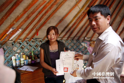 額尼日樂的姐姐格根照拉從頂新公益基金會代表手中接過妹妹的獎學(xué)金,心中感慨萬端(中國臺灣網(wǎng) 蕪?fù)?nbsp;攝)