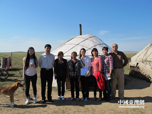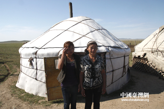 頂新公益基金會工作人員及記者與格根照拉和她的額吉蘇布達(dá)在蒙古包前合影(中國臺灣網(wǎng) 蕪?fù)?nbsp;攝)