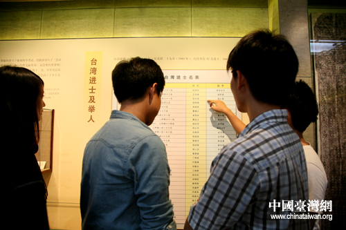 16日下午,來自清華大學、北京大學、中國人民大學、中央民族大學等八所高校的150多名臺灣學生參觀了位于前門附近的臺灣會館。圖為臺生們在臺灣進士及舉人名表上尋找同姓進士。(中國臺灣網 普燕攝)