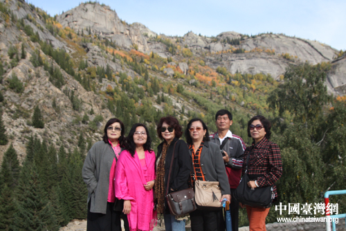 臺灣中南部鄉鎮里長新疆兵團參訪團部分成員在可可托海風景區合影留念。(中國臺灣網 高斯斯 攝)