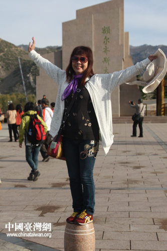 臺灣中南部鄉鎮里長新疆兵團參訪團成員在可可托海風景區合影留念。(中國臺灣網 高斯斯 攝)