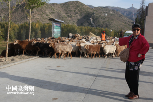 臺灣中南部鄉(xiāng)鎮(zhèn)里長新疆兵團參訪團成員與牧區(qū)羊群合影留念。(中國臺灣網(wǎng) 高斯斯 攝)