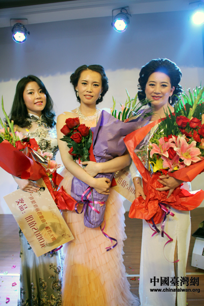 “我愛鄧麗君歌曲模仿大賽”三甲合影,左起杜佳瑤、潘蓬、于紅萍。(中國臺灣網(wǎng) 吳怡 攝)