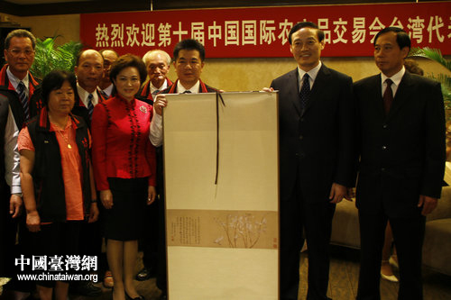 農(nóng)業(yè)部副部長余欣榮向第十屆農(nóng)交會臺灣代表團(tuán)贈送傳統(tǒng)卷軸畫作。(中國臺灣網(wǎng) 郭瑩瑩 攝)