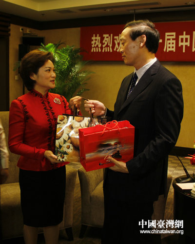 第十屆農(nóng)交會臺灣代表團(tuán)贈送農(nóng)業(yè)部副部長余欣榮阿里山茶葉。(中國臺灣網(wǎng) 郭瑩瑩 攝)