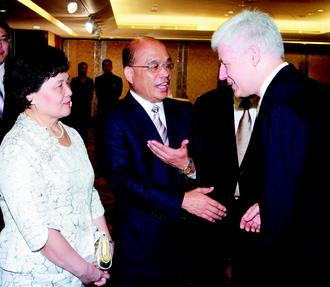 民進(jìn)黨主席蘇貞昌(中)與太太詹秀齡(左)昨天出席民進(jìn)黨26周年黨慶酒會(huì),與AIT臺(tái)北辦事處處長(zhǎng)馬啟思(右)頻頻交換意見。圖片來(lái)源:臺(tái)灣《聯(lián)合報(bào)》