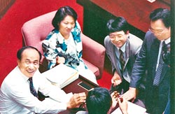 王志雄(左)擔(dān)任臺“立委”時意氣風(fēng)發(fā)。臺灣《中國時報》資料照片