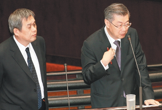 臺當局行政主管部門負責人陳沖(右)昨天在臺立法機構表示,勞;鹩衅飘a風險,臺當局一定會負責任解決;左為臺“勞委會主委”潘世偉。圖片來源:臺灣《聯合報》