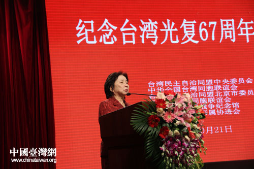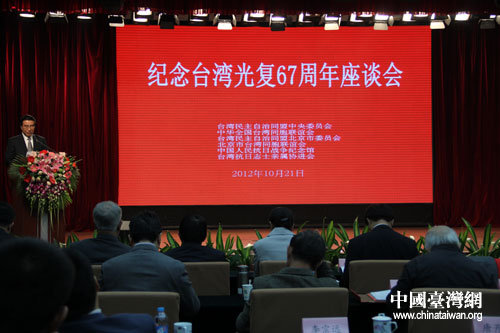 10月21日,由臺盟中央、全國臺聯及北京市臺盟、臺聯,中國人民抗日戰爭紀念館、臺灣抗日志士親屬協進會聯合舉辦的“紀念臺灣光復67周年座談會”在中國人民抗日戰爭紀念館舉行。(中國臺灣網 楊麗 攝)