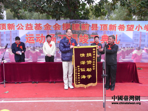 頂新希望小學(xué)王學(xué)文校長(zhǎng)代表全校師生向頂新基金會(huì)回贈(zèng)了感謝錦旗,上書(shū)“捐資助學(xué) 情深似海” (中國(guó)臺(tái)灣網(wǎng)記者 蕪?fù)瑪z)