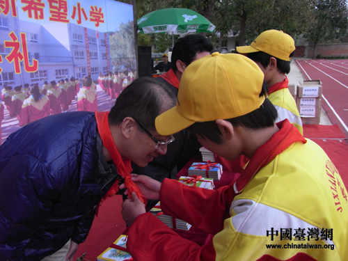 在新落成的運(yùn)動(dòng)場(chǎng)上,學(xué)校的小朋友為頂新公益基金會(huì)理事長(zhǎng)騰鴻年戴上了紅領(lǐng)巾(中國(guó)臺(tái)灣網(wǎng)記者 蕪?fù)瑪z)