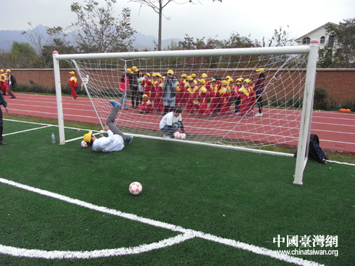 這個(gè)頂新的大哥哥吹牛說(shuō)自己守門是鐵門,“鐵門”大哥哥在小朋友們的八方進(jìn)攻下,終于在撲救一個(gè)刁鉆射門時(shí),摔了個(gè)四腳朝天,逗的小朋友們哈哈大笑(中國(guó)臺(tái)灣網(wǎng)記者 蕪?fù)瑪z)