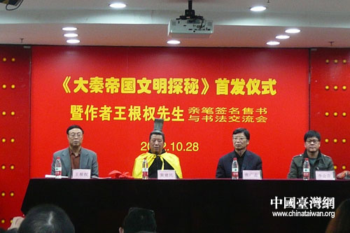 中國臺灣網10月28日北京消息 2012年10月28日上午,《大秦帝國文明探秘》新書發布會在北京王府井新華書店舉行。在《大秦帝國文明探秘》一書中作者王根權用全新的思路帶我們去探秘大秦帝國的文明和解讀秦王朝那些驚天大事。此書是王根權先生歷經十年發掘、考證和研究后寫成的作品。