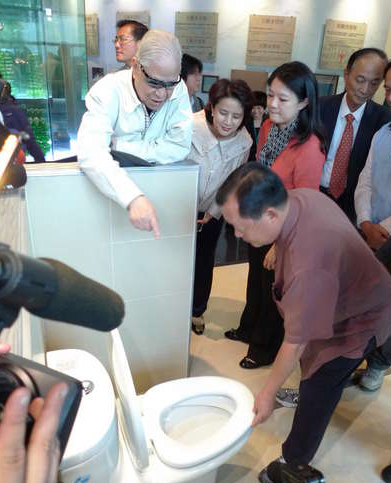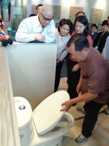 參訪冠軍磁磚綠概念館,當(dāng)李登輝在展示區(qū)看到一個馬桶時,就對一旁劉政鴻說,“掀起來看看!”劉政鴻立刻上前彎腰把馬桶蓋掀開,讓其看仔細(xì)。(中國臺灣網(wǎng) 焦源源)