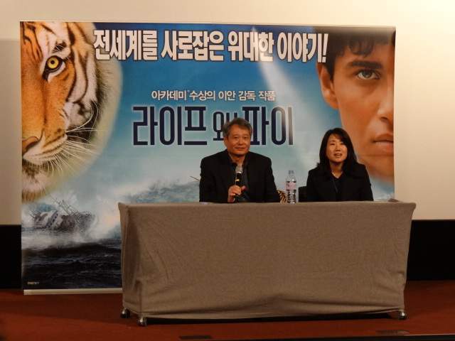李安導(dǎo)演(左)今天在首爾出席《少年P(guān)i的奇幻漂流》的新片宣傳會(huì)(圖片來(lái)源:臺(tái)灣“中廣新聞網(wǎng)”)