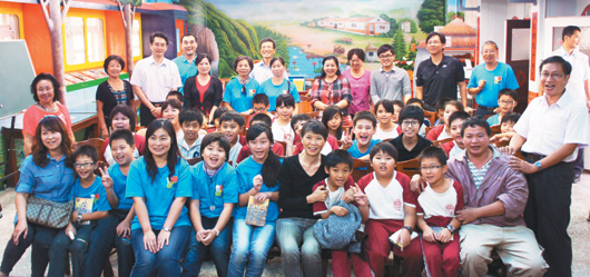 馬英九夫人周美青(中)到彰化縣二林鎮香田小學與小朋友分享故事,讓小朋友感到很開心。圖片來源:臺灣《聯合報》